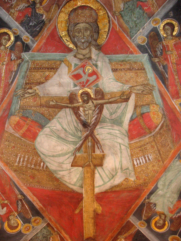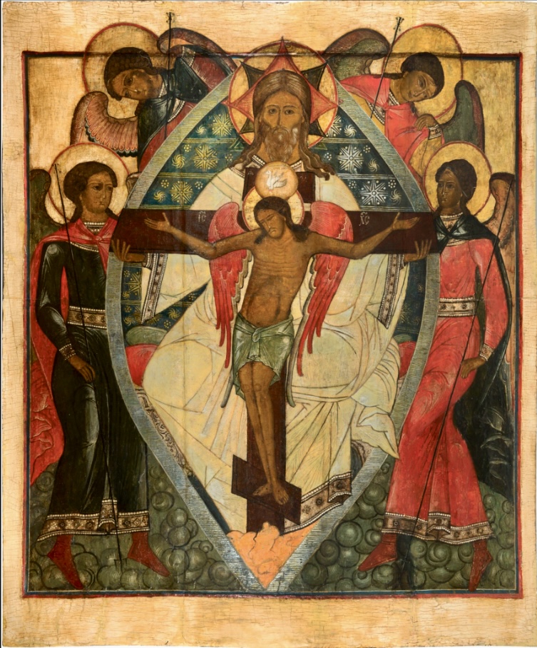It is an iconic representation of the council of the persons of the Holy Trinity, the perfect community of love and self-offering, giving and directing love one to another, and manifested in this salvific-plan to be realised and fulfilled Saviour’s future passion, and the Victory of the Cross.