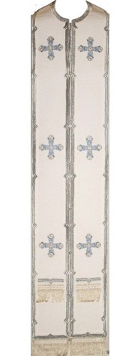 Then the priest vesteth himself thus: taking the sticharion in the left hand, and bowing thrice toward the east, as mentioned before, he signeth it with the sign of the Cross, saying: