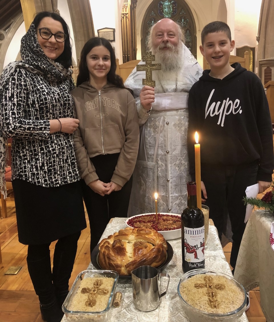 We were happy to welcome first-time visitors, including friends of our Serbian parishioners, for whom bread, zhito (kutia) and wine were blessed in honour of the holy Apostle, Protomartyr and Archdeacon, Stephen, for their family slava, tomorrow. After the blessing of the offerings, the golden Slavski kolač was incised with a cross into which the blessed wine was poured, before the turning of the loaf by the members of the Terzic family and the priest. Young Stefan, played his part in the breaking of the loaf and the kiss of peace as the halves were placed back to back and turned.