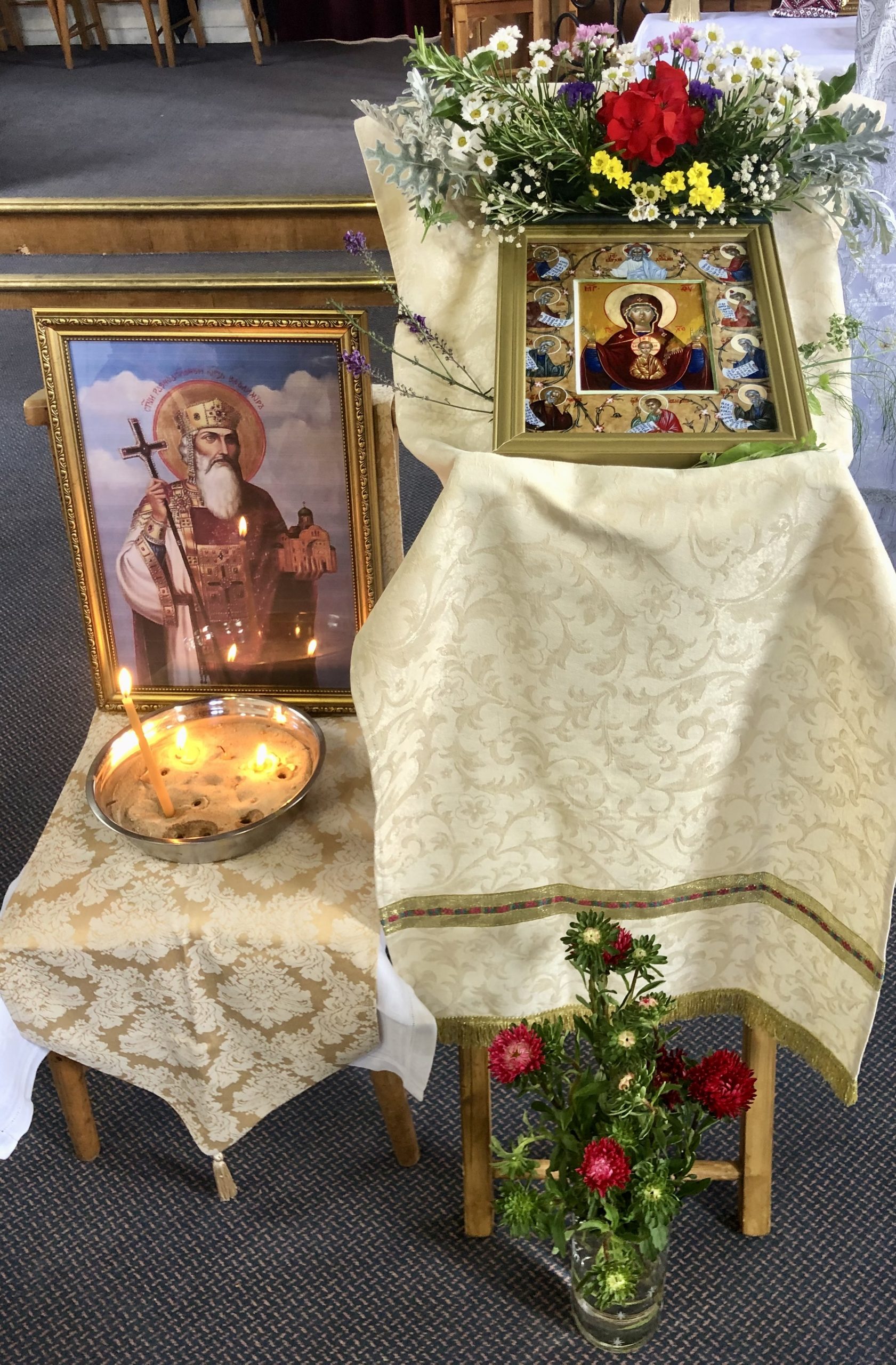 Yet again, the flowers adorning our icons, and vases of late summer blooms added so much to the makeshift setting for our Orthodox worship, tangibly showing parishioners’ love for God and the saints.