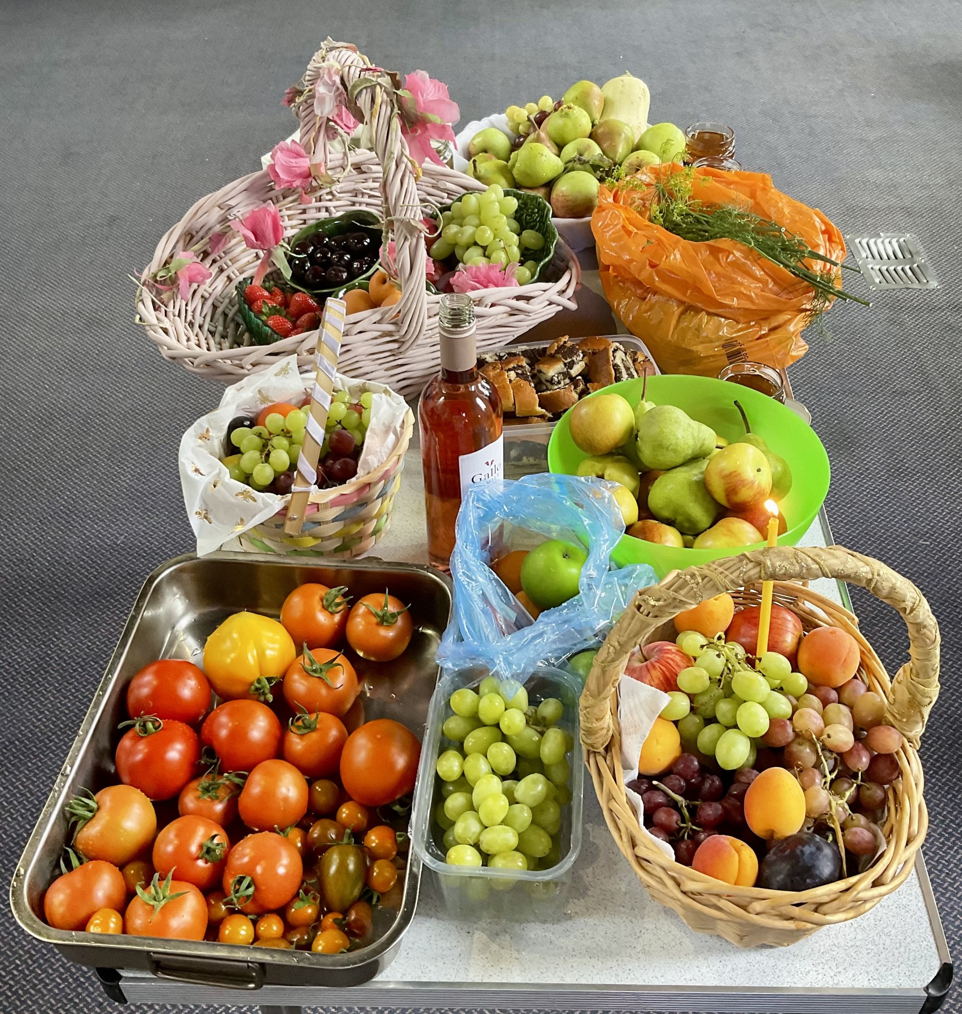 As the summer has advanced, our numbers have petered out, but despite more of our parishioners having departed on their travels, thirty or so – plus the children – participated in a joyous and festive Liturgy, with the blessing of fruit and honey at the end of the service… and what a splendid gathering of the fruits of creation! Thank you to our sisters for the lovely little individual baskets of grapes, which were inspired!