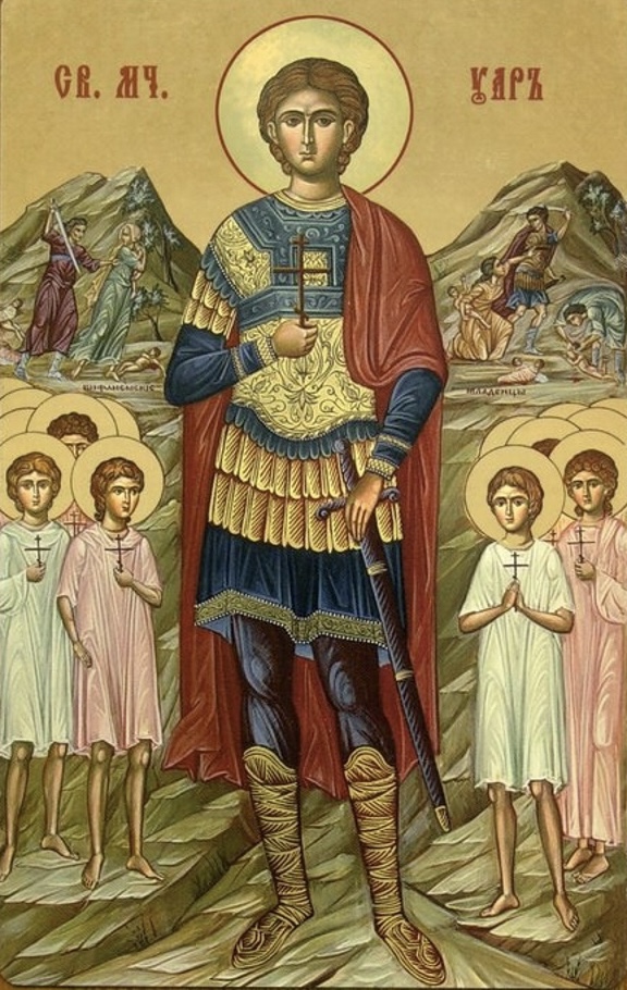 Kontakion, Tone II, Spec. Mel. “Seeking the highest…”: Manfully arming your mind against the enemy, O most lauded martyrs, ye destroyed all their falsehood, receiving the trophy of victory from on high, and crying out with oneness of mind: How good and joyous it is to be with God!