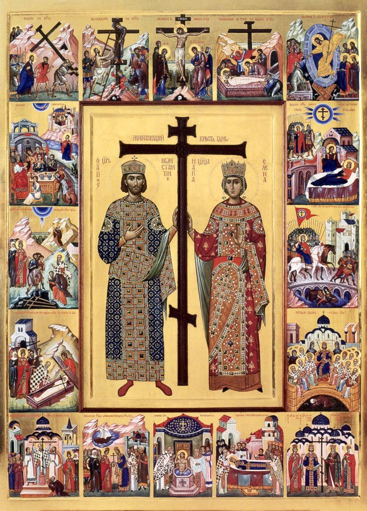Kontakion, Tone III, Spec. Mel. “Today the Virgin …”: Today Constantine and his mother Helena * have revealed the Cross, the most precious Tree, * which putteth to shame all the Jews * and is the weapon of faithful kings against the adversary. ** For our sake the great standard hath appeared, terrible in battle.