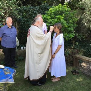 We returned on the eve of the Dormition to baptise Mary before vespers for the feast, which was also her first nameday. We are very grateful to Melangell for making the garden available for adult baptisms and for expressing willingness to do so in the future.