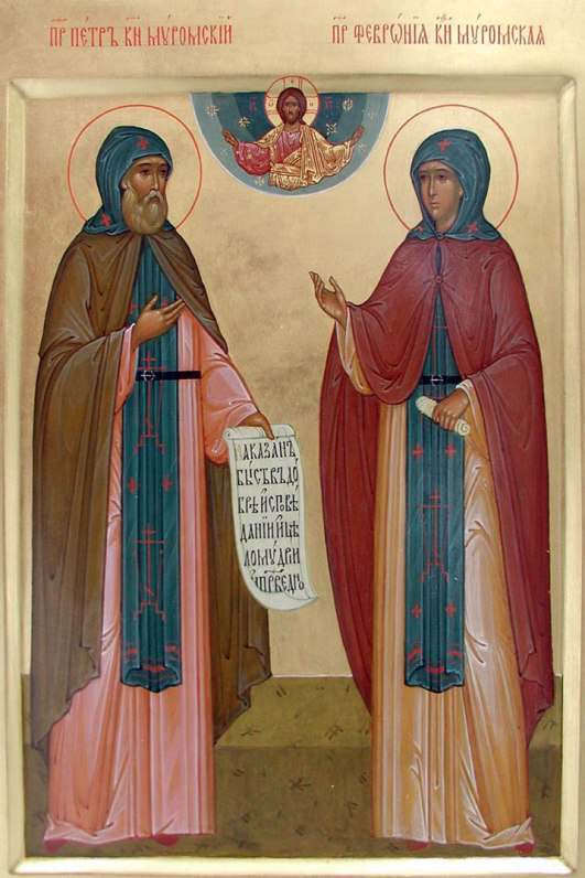 Sessional hymn, in Tone IV: O ye faithful, let us hasten to the blessed and splendid solemnity of Peter and Fevronia as to the shining sun, and let us unceasingly cry out: Even though ye have passed from this earth, O all-glorious ones, ye have not parted from us, but stand with the angels before the Trinity, Whom do ye entreat, that our souls be saved.