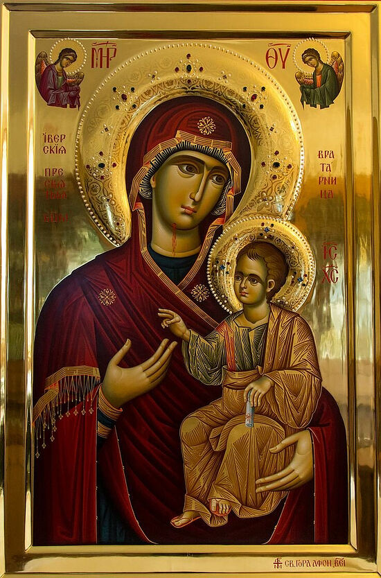 Kontakion, Tone VIII: Even though thy holy icon was cast into the sea by the widow who was unable to save it from the foe, O Theotokos, yet hath it been shown to be the preserver of Mount Athos and the gatekeeper of the Monastery of Iveron, frightening away the enemy and delivering from all misfortunes and dangers them that honour thee in our homeland.
